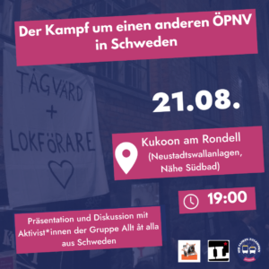 Gemeinsam mit Erfahrungen aus der Kampagne „Wir fahren zusammen“ wollen wir mit den Referent*innen aus Schweden diskutieren, wie ein Kampf um einen klimagerechten ÖPNV aussehen kann.