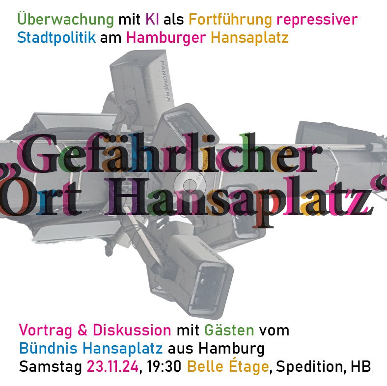 Das Bündnis Hansaplatz hat sich im Sommer 2023 nach Bekanntmachung der KI-Überwachung am Hamburger Hansaplatz gegründet und besteht aus Anwohner*innen, Aktivist*innen und IT-Expert*innen. Statt KI-Überwachung und Repressionen fordern sie unter dem Motto #ReclaimHansaplatz eine Verbesserung der sozialen Umstände vor Ort.