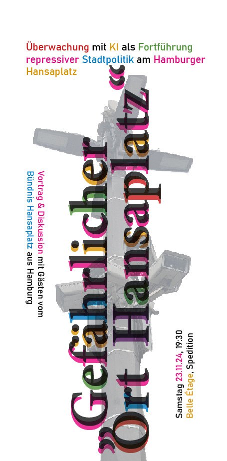In dem Vortrag werden Vertreter*innen aus dem Bündnis Hansaplatz diese Themen beleuchten und dabei auch die irreführende Kommunikation der Hamburger Behörden zur Wirksamkeit der KI-Überwachung in Frage stellen.