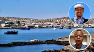 Blick von der Haifischinsel auf die Küste, Lüderitz, Region Karas, Namibia. Im Bild: Paul Thomas (oben) und Tjipura Unaune Tjipura (unten)