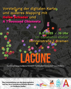 Heike Schader stellt die Lacune Karte vor: Ausgangspunkt des Projektes “Lacune” war es, ihre Recherchen zu lesbischem* Leben in Hamburg in den 1920er Jahren bis zur Machtübernahme der NSDAP 1933 als digitale Karte mit der queeren Mapping Plattform A Thousand Channels zu veröffentlichen.