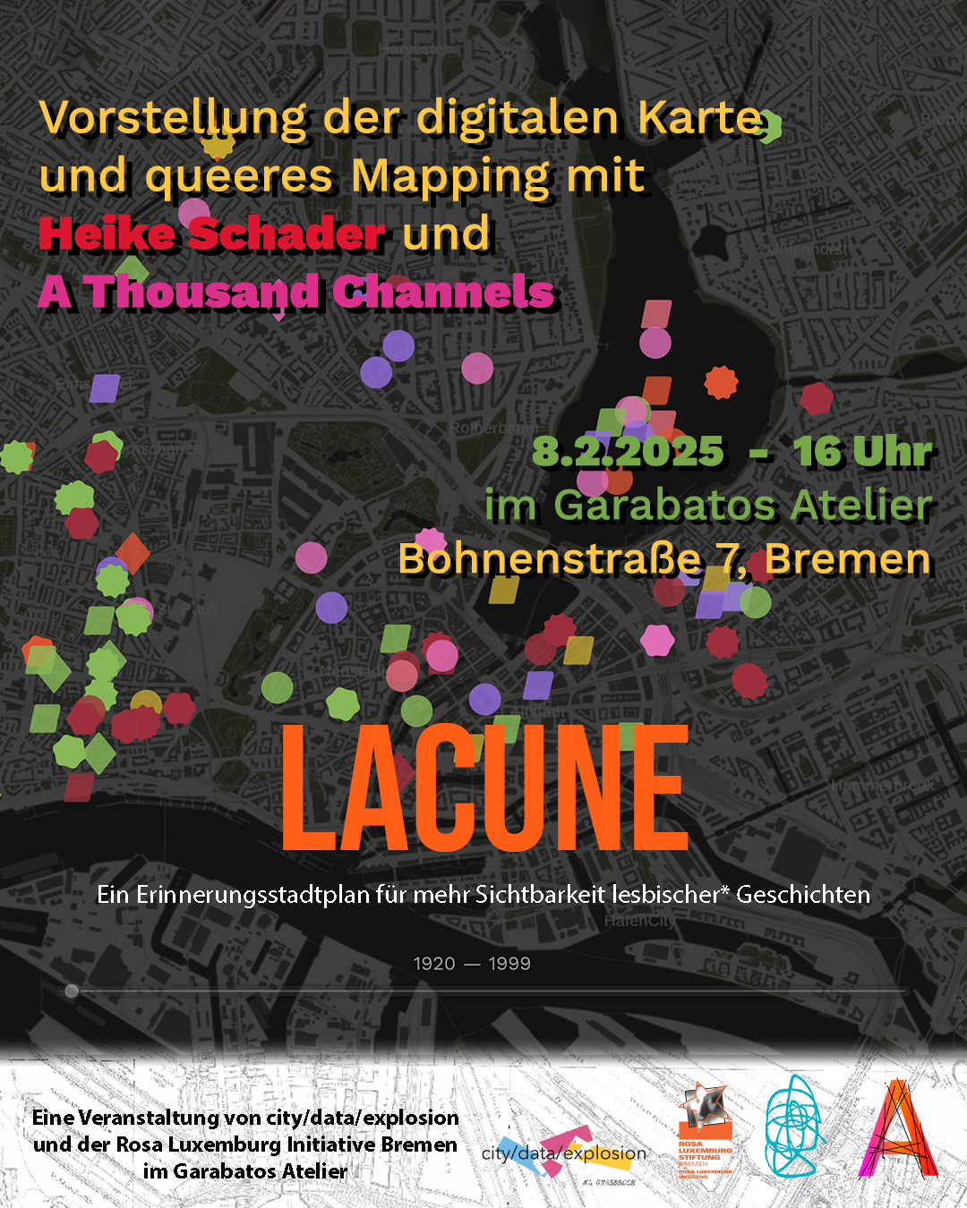 Vorstellung der Lacune Map zu lesbischem* Leben und Orten in Hamburg von den 1920ern bis 1990 und der Mapping Plattform A Thousand Channels, mit Heike Schader, Historikerin aus Hamburg und Autorin der Karte, sowie mit Thomas Böker, Dafne Jaramillo und Ulf Treger (A Thousand Channels).