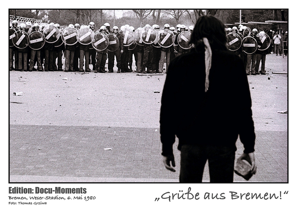 Postkarte mit dem Foto Steinewerfer von Thomas Grziwa vom 6. Mai 1980 vor dem Weserstadion. Quelle https://thomas-grziwa-media.info/2016/11/05/wussten-sie/