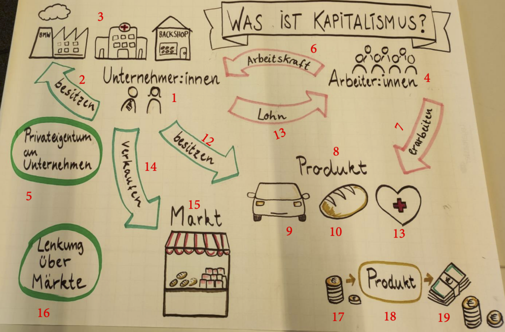 Insgesamt nahmen 14 Schüler:innen einer Berufsschulklasse mit dem Abschlussziel Sozialpädagogik und Hauswirtschaft im Alter von 16 bis 18 Jahren an dem Workshop teil. Im Vordergrund stand die Vermittlung von sozialer Gerechtigkeit. Scheinbar individuell begriffene Problem- und prekäre Lebenslagen sollten als strukturelle Probleme des Kapitalismus und der damit verbundenen Herrschaftsstruktur verstanden und als geteilte Erfahrungen und Problemlagen greifbar gemacht werden. Dass der Kapitalismus ein strukturell ungerechtes System ist, in dem der Zugang zu Ressourcen und Teilhabe nach sozio-ökonomischen Merkmalen strukturiert ist, sollte mit einem breiten Pool an interaktiven und selbstreflektierenden Methoden vermittelt werden. Es wurde bei den lebensweltlichen Erfahrungen der Schüler:innen angesetzt, um einen besseren und nachhaltigen Zugang zum Thema soziale Gerechtigkeit zu erlangen. Schon mit der ersten Methode konnte wir dieses Lernziel den Schüler:innen etwas näher bringen. Durch das Hineinversetzen in eine soziale Rolle, beispielsweise „migrantisch, Arbeiter:in und homosexuell“, konnten die Schüler:innen erkennen, dass bestimmte sozio-ökonomische Merkmale die Zugänge zu gesellschaftlichen Ressourcen und Teilhabe einschränken. Hierbei wurde auch auf das Prinzip der Intersektionalität eingegangen. In der folgenden Methode wurde diese Perspektive verstärkt wahrgenommen. Es wurde den Schüler:innen vermittelt, dass es Lohnarbeit gibt, die trotz ihrer gesellschaftlicher Wichtigkeit monetär und auch gesellschaftlich abgewertet wird. Mithilfe der Methode „Wer hat, dem wird gegeben“ konnte im Anschluss gemeinsam mit den Schüler:innen herausgearbeitet werden, dass sie als Arbeiter:innen/Erwerbslose nicht gerecht am gesellschaftlichen Wohlstand partizipieren können, da wir in einer kapitalistischen Gesellschaft leben, in der der Wohlstand denjenigen zuteil kommt, die Unternehmen besitzen bzw. erben. Mit einem kurzen Input, wie der Kapitalismus funktioniert und strukturiert ist, konnte dieses für viele neu erworbene Wissen nochmal gestärkt werden.