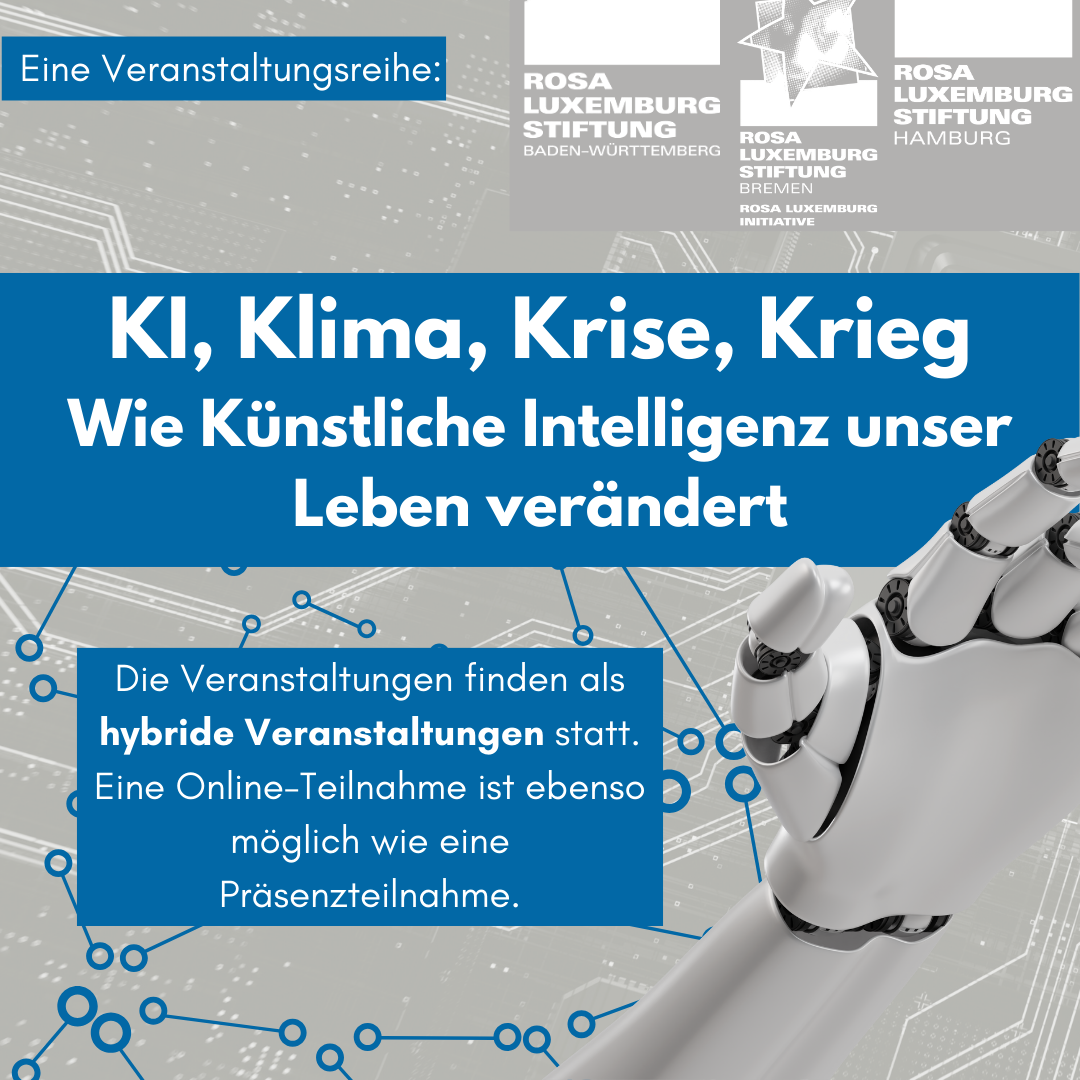 Am 10. Juli 2024 startet eine gemeinsame Veranstaltungsreihe „KI, Klima, Krise, Krieg – Wie Künstliche Intelligenz unser Leben verändert“ der Rosa-Luxemburg-Landesstiftungen Baden-Württemberg, Bremen und Hamburg.