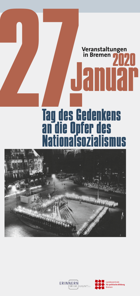 Zum »Tag des Gedenkens an die Opfer des Nationalsozialismus« wird auch kommendes Jahr wieder rund um den 27. Januar ein gemeinsames Bremer Veranstaltungsprogramm angeboten, koordiniert vom der Landeszentrale für politische Bildung und dem Verein »Erinnern für die Zukunft«. Ein Programm-Faltblatt kann u.a. bei der Landeszentrale abgeholt und steht hier auf unserer Website als PDF zum Download bereit: Faltblatt zum 27. Januar 2020. Die Rosa-Luxemburg-Initiative unterstützt »Erinnern für die Zukunft« . Die gedruckte Version des Flyers kann ab dem 16.12. in der Landeszentrale abgeholt werden.