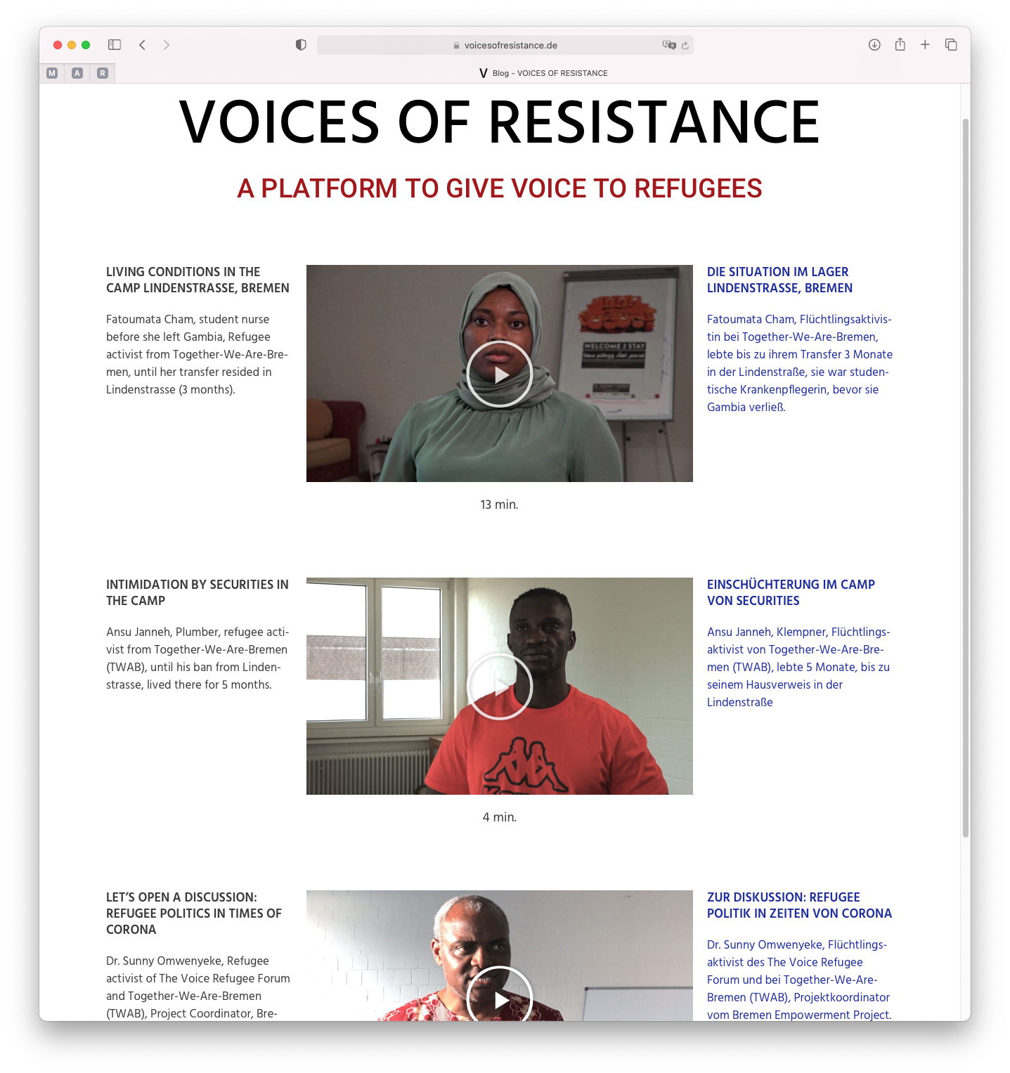 Wir stellen heute die Website „Voices of Resistance“ vor. Dies ist ein neues Videoprojekt, das Refugees und Aktivist*innen aus Bremen und darüber hinaus eine Stimme gibt. Es werden Kommentare, Interviews, Diskussionen und Reden zu einem breiten Spektrum an Themen präsentiert, die sich auf Refugees, Migrant*innen und die deutsche Gesellschaft insgesamt beziehen.