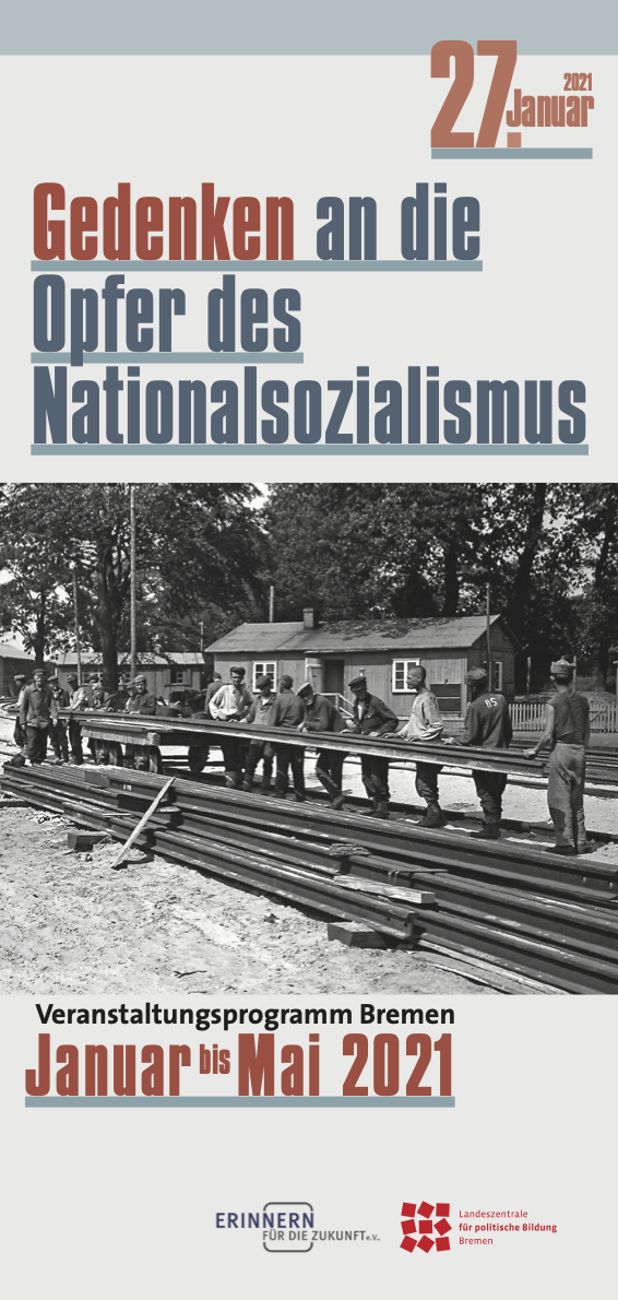 Zum »Tag des Gedenkens an die Opfer des Nationalsozialismus« wird auch kommendes Jahr wieder rund um den 27. Januar ein gemeinsames Bremer Veranstaltungsprogramm angeboten, koordiniert von der Landeszentrale für politische Bildung und dem Verein »Erinnern für die Zukunft«. Das Programm-Faltblatt steht hier auf unserer Website als PDF zum Download bereit: Faltblatt zum 27. Januar 2021. Die gedruckte Version des Flyers kann in der Landeszentrale abgeholt werden. – Die Rosa-Luxemburg-Initiative unterstützt »Erinnern für die Zukunft«.