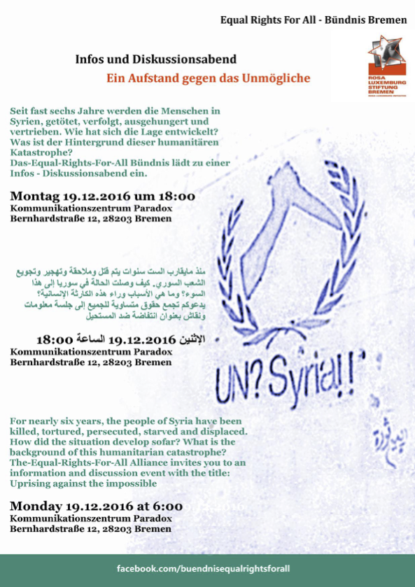 Update – Veranstaltungsbericht: Der Krieg in Syrien und im Irak – Wohin führt die linke Debatte? Paloma Quinteros war am 3. Dezember 2014 dabei und hat Ausschnitte aus der Diskussion und weiterführende Fragen notiert.