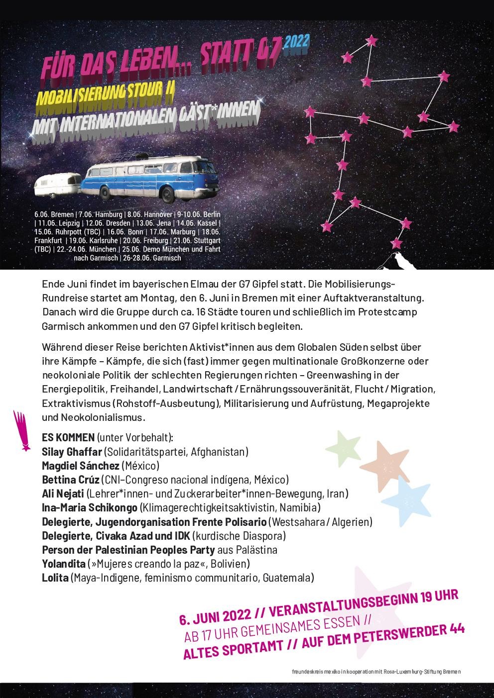 Ende Juni findet im bayerischen Elmau der G7 Gipfel statt. Genauso wie vor 7 Jahren, organisieren Menschen aus diesem Anlass eine G7-Informations-Rundreise. Diese Reise wird am 6. Juni 2022 in Bremen mit einer Auftaktveranstaltung starten. Danach wird die Gruppe durch ca. 16 Städte touren und schließlich im Protestcamp Garmisch ankommen und den G7 Gipfel kritisch und von unten begleiten.
