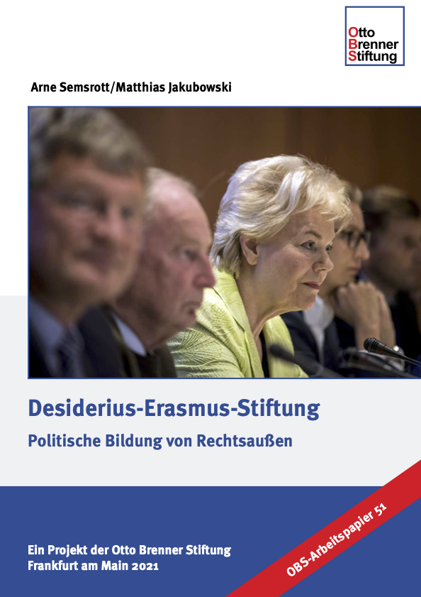 Eingeladen ist Matthias Jakubowski, Jurist, Co-Autor des Arbeitspapiers der Otto-Brenner-Stiftung „Desiderius-Erasmus-Stiftung. Politische Bildung von Rechtsaußen“.