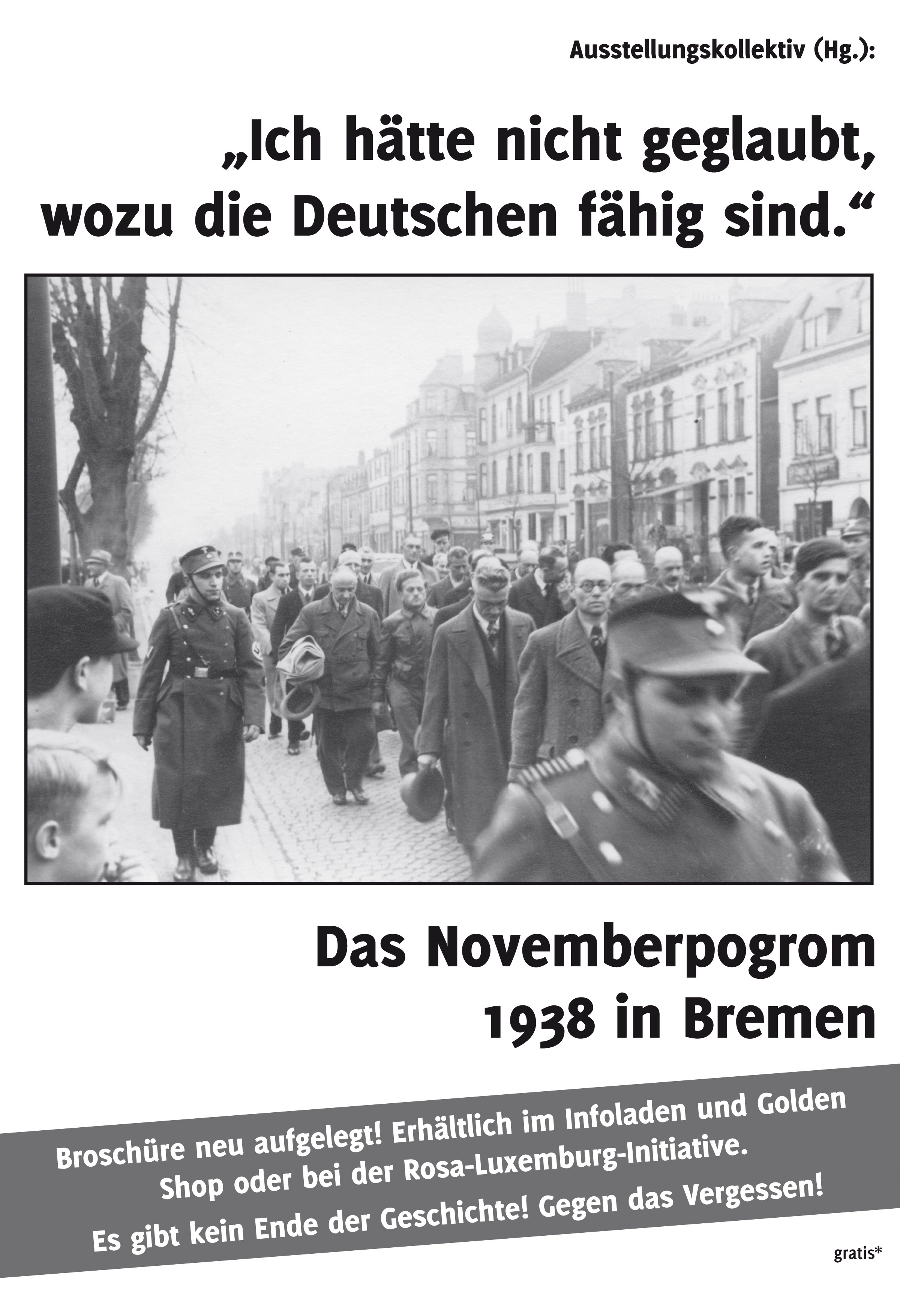 Im Jahre 2008 hat die Rosa-Luxemburg-Initiative eine Veranstaltungsreihe zur Erinnerung an den Holocaust und zur Kritik am Antisemitismus mitveranstaltet. Die Reihe stand dem Titel „’Ich hätte nicht geglaubt, wozu die Deutschen fähig sind.’ Das Novemberpogrom 1938 in Bremen“. In diesem Rahmen wurde auch eine Ausstellung zum Novemberpogrom in Bremen erarbeitet und gezeigt. Die vorliegende Broschüre dokumentiert diese Ausstellung und erschien erstmals im Anschluss an die Veranstaltungsreihe Anfang 2009. Die erste Auflage ist inzwischen vergriffen, aus Anlass des Gedenkens zum 75. Jahrestages des „Novemberpogroms“ soll die Broschüre wieder der interessierten Öffentlichkeit zur Verfügung gestellt werden.